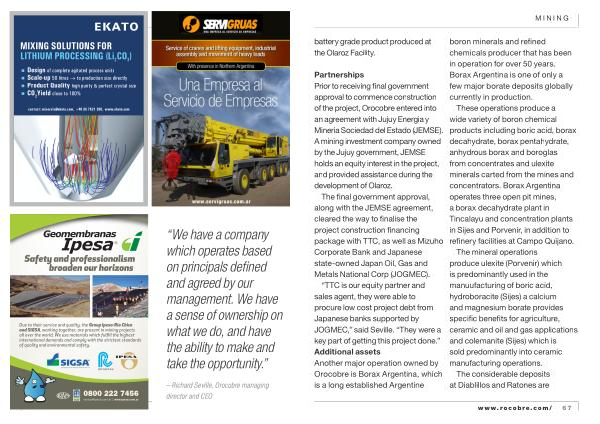 “ TTC is our equity partner and sales agent , they were able to procure low cost project debt from Japanese banks supported by JOGMEC ,” said Seville . “ They were a key part of getting this project done .” Additional assets Another major operation owned by Orocobre is Borax Argentina , which is a long established Argentine boron minerals and refined chemicals producer that has been in operation for over 50 years . Borax Argentina is one of only a few major borate deposits globally currently in production .