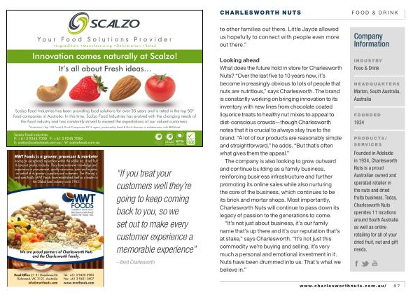 “ It ’ s not just about business , it ’ s our family name that ’ s up there and it ’ s our reputation that ’ s at stake ,” says Charlesworth . “ It ’ s not just this commodity we ’ re buying and selling , it ’ s very much a personal and emotional investment in it . Nuts have been drummed into us . That ’ s what we believe in .” www . charlesworthnuts . com . au / 87