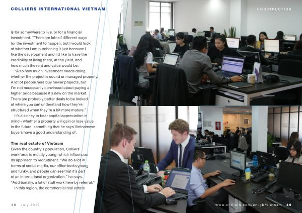 The real estate of Vietnam Given the country ’ s population , Colliers ’ workforce is mostly young , which influences its approach to recruitment . “ We do a lot in terms of social media , our office looks young and funky , and people can see that it ’ s part of an international organization ,” he says . “ Additionally , a lot of staff work here by referral .”