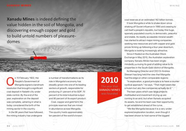 The year that XANADU MINES was founded coal reserves at an estimated 162 billion tonnes . It took Mongolia a while to shake down since shaking off Soviet influence in 1990 and ceasing to call itself a people ’ s republic , but today this huge , sparsely populated country is democratic , peaceful and stable . Its readily accessible mineral wealth has started to attract major mining companies seeking new resources and with copper and gold prices firming up following a four-year downturn , Mongolia is looking increasingly attractive .
