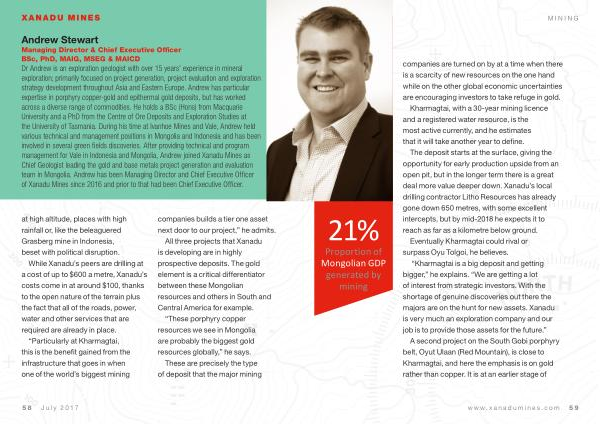 “ Kharmagtai is a big deposit and getting bigger ,” he explains . “ We are getting a lot of interest from strategic investors . With the shortage of genuine discoveries out there the majors are on the hunt for new assets . Xanadu is very much an exploration company and our job is to provide those assets for the future .”