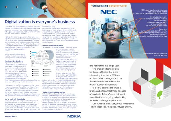 The Revolution into Digital Business Nokia ’ s end-to-end cloud portfolio and services are ready for production right now . And right now Nokia is helping customers in all sectors to grow revenue by creating new models for old services , enabling new revenue generating applications and by literally changing how they do business . Nokia is the partner for the digital transformation . It ’ s the partner for moving business to the cloud . And together with its partners , clients and end users , Nokia is building the foundation for 5G and beyond . www . nokia . com