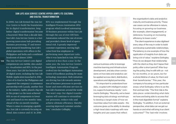 In 2006 , Sun Life formed the Asia Service Centre to build the foundations for its digital transformation , long before ‘ digital transformation ’ became a buzzword . More than a decade later , Sun Life ’ s Asia Service Centre is a fastgrowing innovation hub providing business processing , IT and investment research benefitting Sun Life ’ s global operations with offices in the Philippines and India and a combined headcount of almost 3,000 . The Asia Service Centre ’ s core digital competencies are mobile , data analytics , visualisation and RPA . In the past three years , Sun Life has launched over 20 digital assets , including the Sun Life Mobile Application launched in 2016 , a first of its kind in the Philippines and supported the company ’ s e-commerce partnership with Lazada , another first in the industry . Agility played a big role in this project as the team achieved 80 % re-use of components to lower cost and launch in two months ’ time , ahead of the six-month timeline . When it comes to emerging capabilities , Sun Life is currently focusing on cloud , data science and AI . In 2018 ,