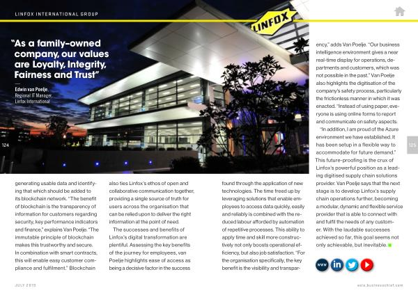 “ In addition , I am proud of the Azure environment we have established . It has been setup in a flexible way to accommodate for future demand .” This future-proofing is the crux of Linfox ’ s powerful position as a leading digitised supply chain solutions provider . Van Poelje says that the next stage is to develop Linfox ’ s supply chain operations further , becoming a modular , dynamic and flexible service provider that is able to connect with and fulfil the needs of any customer . With the laudable successes achieved so far , this goal seems not only achievable , but inevitable .