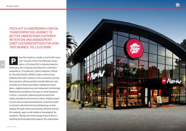 P izza Hut wants to create a world with more ‘ yum ’. As part of the Yum ! Brands corporation , a Fortune 500 company based in Kentucky , the company prioritises its customers ’ experience . Troy Barnes , Chief Customer Officer for the Asia Pacific ( APAC ) region at Pizza Hut , believes that with a focus on the consumer journey , the business will see positive results . Barnes ’ role is made up of three key pillars : restaurant excellence , digital experience and restaurant technology . “ Restaurant excellence focuses on what happens in store – products , delivering pizzas and food safety standards and service culture . Digital experience is about understanding how customers want to interact with the brand and delivering on that , largely through online purchasing , whether that be the website , app , social media or messaging ” he explains . “ Restaurant technology looks at the underlying technologies that support the employees