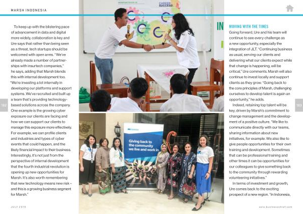 Going forward , Ure and his team will continue to see every challenge as a new opportunity , especially the integration of JLT . “ Continuing business as usual , serving our clients and delivering what our clients expect while that change is happening , will be critical ,” Ure comments . Marsh will also continue to invest locally and support clients as they grow . “ Going back to the core principles of Marsh , challenging ourselves to develop talent is again an opportunity ,” he adds .