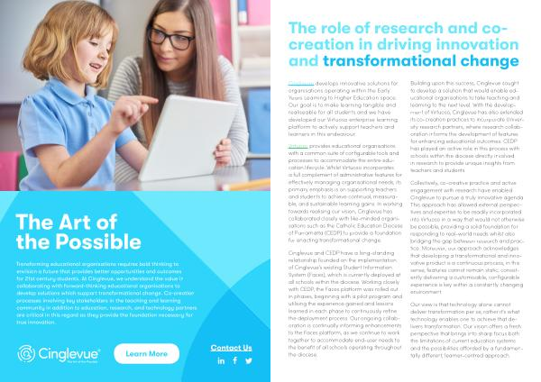 Transforming educational organisations requires bold thinking to envision a future that provides better opportunities and outcomes for 21st century students . At Cinglevue , we understand the value in collaborating with forward-thinking educational organisations to develop solutions which support transformational change . Co-creation processes involving key stakeholders in the teaching and learning community in addition to education , research , and technology partners are critical in this regard as they provide the foundation necessary for true innovation .