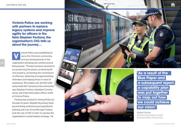 Victoria Police are working with partners to replace legacy systems and improve agility for officers in the field . Stephen Fontana , the organisation ’ s CIO , tells us about the journey …