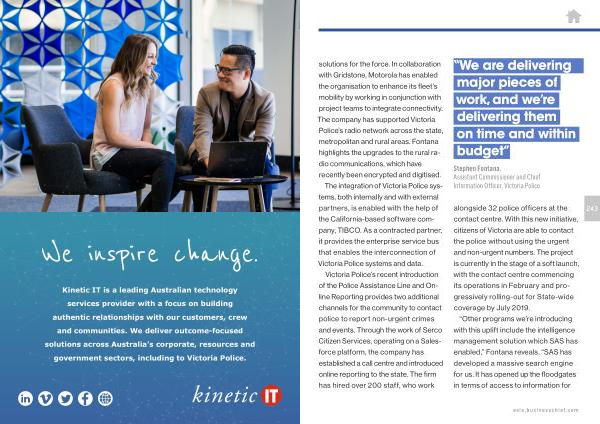 solutions for the force . In collaboration with Gridstone , Motorola has enabled the organisation to enhance its fleet ’ s mobility by working in conjunction with project teams to integrate connectivity . The company has supported Victoria Police ’ s radio network across the state , metropolitan and rural areas . Fontana highlights the upgrades to the rural radio communications , which have recently been encrypted and digitised .