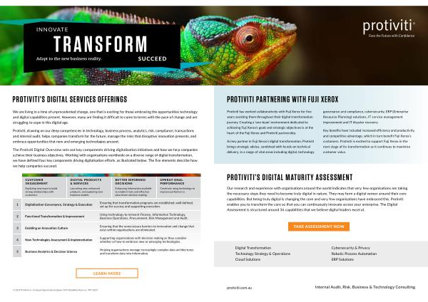 Our research and experience with organisations around the world indicates that very few organisations are taking the necessary steps they need to become truly digital in nature . They may form a digital veneer around their core capabilities . But being truly digital is changing the core and very few organisations have embraced this . Protiviti enables you to transform the core so that you can continuously innovate across your enterprise . The Digital Assessment is structured around 36 capabilities that we believe digital leaders excel at .