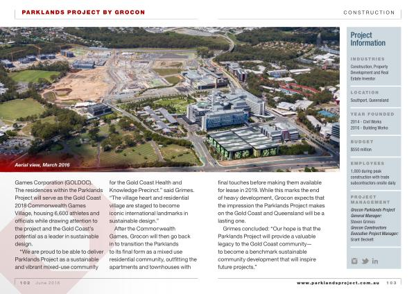 Grocon Parklands Project General Manager : Steven Grimes Grocon Constructors Executive Project Manager : Grant Beckett www . parklandsproject . com . au 103
