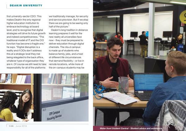 first university-sector CDO . This makes Deakin the only regional higher education institution to embrace technology at board level , and to recognise that digital strategies will drive its future growth and indeed competitiveness . “ The traditional model of IT and the CIO function has become a fragile one ,” he says . “ Digital disruption is a reality and if CIOs don ’ t address this at a strategic level they risk being relegated to the back office , whatever type of organisation they are in . Of course we still need to take responsibility for all of the platforms we traditionally manage , for security and service provision . But if we stop there we are going to be seeing only half of the picture .”