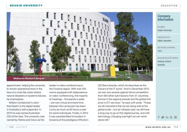 William Confalonieri ’ s claim that Deakin is the digital leader in Australia is well supported . In 2014 he was named Australian CIO of the Year . The university was named by Telstra and Cisco as the leader in video-conferencing in the Oceania region . With over 250 rooms equipped with telepresence or video-conferencing , the majority of meetings – thousands a week – are now virtual and travel time between the campuses has been cut by as much as 80 hours a year for some individuals . Finally , in 2014 it was awarded Best Innovation in Oceania at the prestigious Wharton-