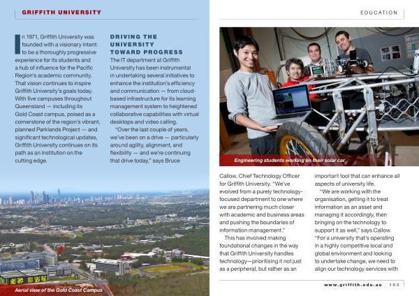 DRIVING THE UNIVERSITY TOWARD PROGRESS The IT department at Griffith University has been instrumental in undertaking several initiatives to enhance the institution ’ s efficiency and communication — from cloudbased infrastructure for its learning management system to heightened collaborative capabilities with virtual desktops and video calling .