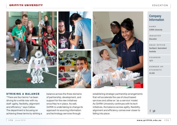 STRIKING A BALANCE “ There are four terms I ’ ve been driving for a while now with my staff : agility , flexibility , alignment and efficiency ,” says Callow . The department is focusing on achieving these terms by striking a balance across the three domains of partnership , development , and support for the new initiatives once they ’ re in place . As well , Griffith is undertaking to change its approach to sourcing information and technology services through