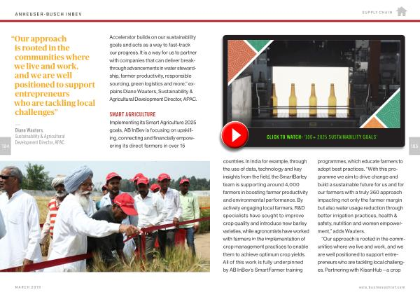 CLICK TO WATCH : ‘ 100 + 2025 SUSTAINABILITY GOALS ’ 185 countries . In India for example , through the use of data , technology and key insights from the field , the SmartBarley team is supporting around 4,000 farmers in boosting farmer productivity and environmental performance . By actively engaging local farmers , R & D specialists have sought to improve crop quality and introduce new barley varieties , while agronomists have worked with farmers in the implementation of crop management practices to enable them to achieve optimum crop yields . All of this work is fully underpinned by AB InBev ’ s SmartFarmer training programmes , which educate farmers to adopt best practices . “ With this programme we aim to drive change and build a sustainable future for us and for our farmers with a truly 360 approach impacting not only the farmer margin but also water usage reduction through better irrigation practices , health & safety , nutrition and women empowerment ,” adds Wauters .