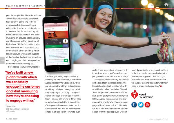 Shane Riddle CIO , National Heart Foundation of Australia involves gathering together every morning for a few minutes , a part of the Agile philosophy he ’ s brought in . “ People talk about what they did yesterday , what they didn ’ t get through and what they ’ re going to do today . That gets communication working across the team – people can chime in if they hear of a roadblock and offer suggestions . Other groups have now started to pick up on that as well and for me that was encouraging as I didn ’ t want to push
