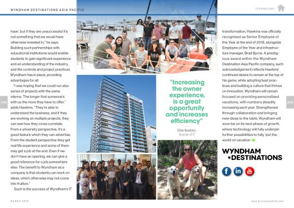 248 have ’, but if they are unsuccessful it ’ s not something that we would have otherwise invested in ,” he says . Building such partnerships with educational institutions would enable students to gain significant experience and an understanding of the industry , and the controls and project practices Wyndham has in place , providing advantages for all .
