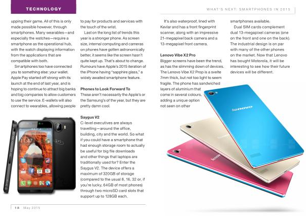 Lenovo Vibe X2 Pro Bigger screens have been the trend , as has the slimming down of devices . The Lenovo Vibe X2 Prop is a svelte 7mm thick , but not too light to seem fragile . The phone has sandwiched layers of aluminium that come in several colours , adding a unique option not seen on other smartphones available . Dual SIM cards complement dual 13-megapixel cameras ( one on the front and one on the back ). The industrial design is on par with many of the other phones on the market . Now that Lenovo has bought Motorola , it will be interesting to see how their future devices will be different .