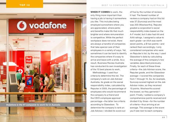 Methodology : I used four criteria to determine this list . The company ’ s rank on Job Advisor Australia , its grade on the social responsibility index , calculated by Reputex in 2005 , the percentage of employees who would recommend the company to a friend and the CEO ’ s employee approval percentage — the latter two criteria according to Glassdoor . To determine the company ’ s rank on Job Advisor , I divided its score out of five by the number of reviews it had . The fewest number of reviews a company had on this list was 37 ( Suncorp ) and the most was 200 ( Woolworths ). Reputex graded a corporation ’ s social responsibility index based on the A-F model , but it also had AA and AAA ratings . I assigned a value to each grade — an AAA was worth seven points , a B two points — and ranked them accordingly . I only considered companies who were on Reputex ’ s list , by the way . I used Glassdoor ’ s data by calculating the average of the company ’ s two variables described previously . Finally , for each of these three criteria — the Job Advisor score , the Reputex grade , and the Glassdoor average — I scored the companies from 1 through 10 . So , for example , Suncorp scored highest on the Job Advisor index , so they received 10 points . Woolworths scored the lowest , so they garnered 1 point . Finally , I added a company ’ s comprehensive points received and divided it by three — for the number of criteria — thus arriving at an average . This average is the score you ’ ll see next to each company .