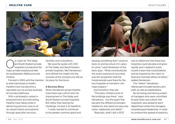 A Success Story When Henderson joined Healthe Care there was a lot of room for improvement in The Valley and South Eastern private hospitals . But rather than fearing the challenge , he took it on headfirst . “ I really wanted to contribute to the greater common good and