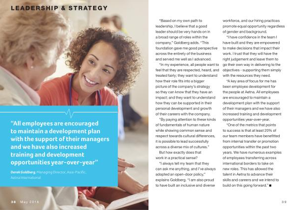 “ One of the metrics that points to success is that at least 20 % of our team members have benefitted from internal transfer or promotion opportunities within the past two years . We have numerous examples of employees transferring across international borders to take on new roles . This has allowed the talent in Aetna to advance their skills and careers and we intend to build on this going forward .”
