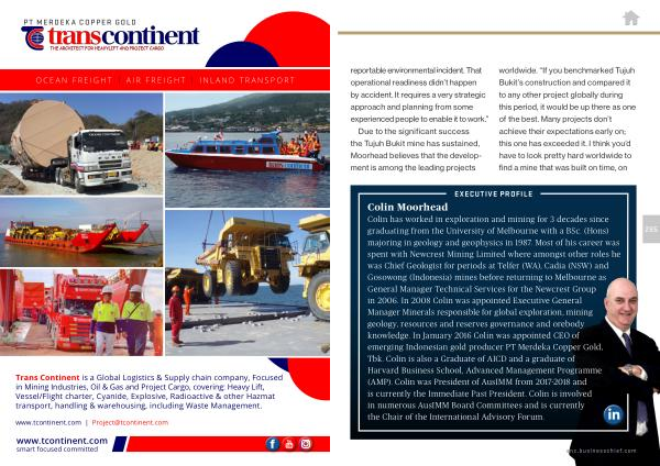 Colin has worked in exploration and mining for 3 decades since graduating from the University of Melbourne with a BSc . ( Hons ) majoring in geology and geophysics in 1987 . Most of his career was spent with Newcrest Mining Limited where amongst other roles he was Chief Geologist for periods at Telfer ( WA ), Cadia ( NSW ) and Gosowong ( Indonesia ) mines before returning to Melbourne as General Manager Technical Services for the Newcrest Group in 2006 . In 2008 Colin was appointed Executive General Manager Minerals responsible for global exploration , mining geology , resources and reserves governance and orebody knowledge . In January 2016 Colin was appointed CEO of emerging Indonesian gold producer PT Merdeka Copper Gold , Tbk . Colin is also a Graduate of AICD and a graduate of Harvard Business School , Advanced Management Programme ( AMP ). Colin was President of AusIMM from 2017-2018 and is currently the Immediate Past President . Colin is involved in numerous AusIMM Board Committees and is currently the Chair of the International Advisory Forum .