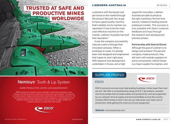ESCO products are trusted at mines worldwide for productivity and safety , and the Nemisys tooth and lip system is engineered to deliver those same benefi ts . The optimized lip is better sized for today ’ s machines and the streamlined profi le maximizes production . The hammerless tooth and shroud systems help reduce maintenance costs through improved reliability , faster and safer replacement , and improved lip coverage . Available as a complete lip system or a stand-alone tooth system .