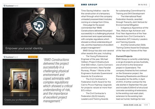 Current Projects BMD Group is currently undertaking a range of projects across Australia , one of which is the Grosvenor project in Queensland . The company finished its first contract on the Grosvenor project , the Pioneering Roadworks and Boxcut Excavation for the drifts , in April of 2013 . A further contract for the site started in September this year and includes 8,000m3 of structural concrete consisting of extensions to the existing coal wash plant , extension to the existing train load out tunnel , footings for new