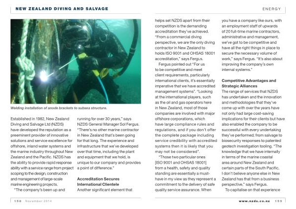 “ The company ’ s been up and running for over 30 years ,” says NZDS General Manager Sol Fergus . “ There ’ s no other marine contractor in New Zealand that ’ s been going for that long . The experience and infrastructure that we ’ ve developed over that time , including the plant and equipment that we hold , is unique to our company and provides a point of difference .”