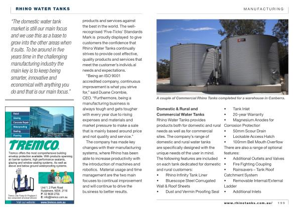www . tremco . com . au products and services against the best in the world . The wellrecognised ‘ Five-Ticks ’ Standards Mark is proudly displayed to give customers the confidence that Rhino Water Tanks continually strives to provide cost effective , quality products and services that meet the customer ’ s individual needs and expectations .