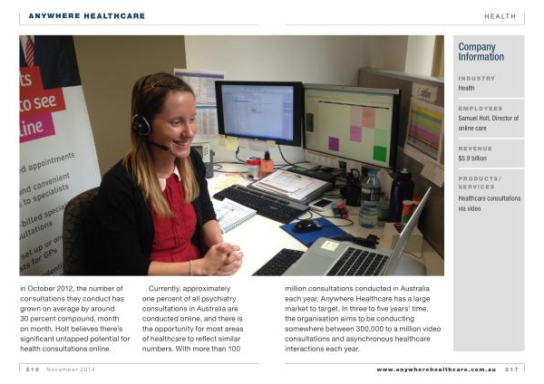 Healthcare consultations via video million consultations conducted in Australia each year , Anywhere Healthcare has a large market to target . In three to five years ’ time , the organisation aims to be conducting somewhere between 300,000 to a million video consultations and asynchronous healthcare interactions each year . www . anywherehealthcare . com . au 217