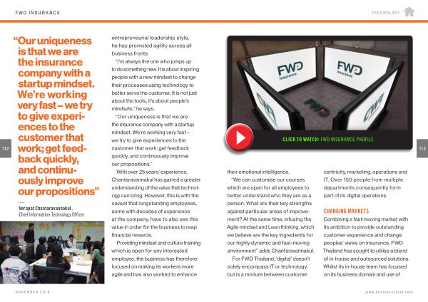 CLICK TO WATCH : FWD INSURANCE PROFILE 113 their emotional intelligence . “ We can customise our courses which are open for all employees to better understand who they are as a person . What are their key strengths against particular areas of improvement ? At the same time , infusing the Agile mindset and Lean thinking , which we believe are the key ingredients for our highly dynamic and fast-moving environment ” adds Chantaravannakul .