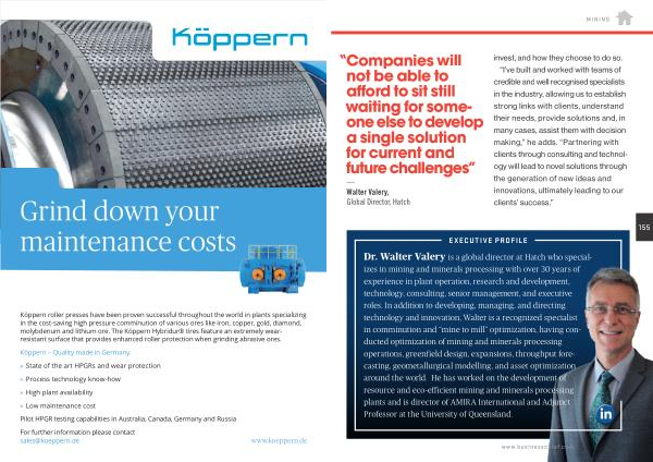 Dr . Walter Valery is a global director at Hatch who specializes in mining and minerals processing with over 30 years of experience in plant operation , research and development , technology , consulting , senior management , and executive roles . In addition to developing , managing , and directing technology and innovation , Walter is a recognized specialist in comminution and “ mine to mill ” optimization , having conducted optimization of mining and minerals processing operations , greenfield design , expansions , throughput forecasting , geometallurgical modelling , and asset optimization around the world . He has worked on the development of resource and eco-efficient mining and minerals processing plants and is director of AMIRA International and Adjunct Professor at the University of Queensland .