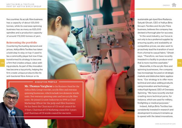 ENERGY sustainable gel-dyed fibre Radianza . Satyaki Ghosh , CEO of Aditya Birla Group ’ s Textiles and Acrylic Fibre business , believes the company has devised a thorough plan for success .