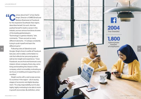 Curious about tech ” is how Sarita Singh , Director of SMB ( Small and Medium Business ) at Facebook for the expansive Southeast Asia region , describes herself . As such , she has pushed herself to build a career in the industry across various functions at some of the leading global players . “ Technology ’ s a genius industry ,” she comments . “ There are just so many different elements – I ’ m always constantly trying to push myself and learn the different parts .”