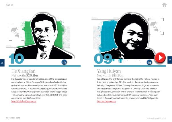 Yang Huiyan , the only female to make the list , is the richest woman in Asia . Having gained her $ 21.9bn worth in the property development industry , Yang owns 55 % of Country Garden Holdings and comes in at # 43 globally . Yang is the daughter of Country Garden ’ s founder Yang Guoqiang , and took on her share of the firm when the company debuted on the stock market in 2007 . Country Garden is headquartered in Guangdong and currently employs around 70,000 people . http :// en . bgy . com . cn