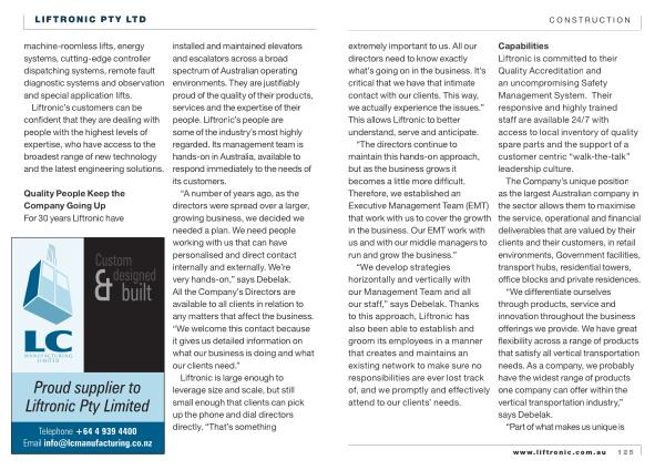 CONSTRUCTION extremely important to us . All our directors need to know exactly what ’ s going on in the business . It ’ s critical that we have that intimate contact with our clients . This way , we actually experience the issues .” This allows Liftronic to better understand , serve and anticipate .