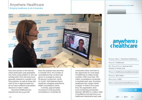 Industry : Healthcare conducted online , and there is the opportunity for most areas of healthcare to reflect similar numbers . With more than 100 million consultations conducted in Australia each year , Anywhere Healthcare has a large market to target . In three to five years ’ time , the organisation aims to be conducting somewhere between 300,000 to a million video consultations and asynchronous healthcare interactions each year .