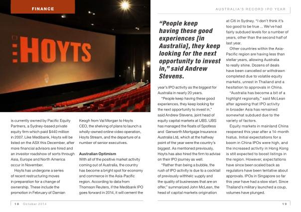 “ People keep having these good experiences , they keep looking for the next opportunity to invest in ,” said Andrew Stevens , joint head of equity capital markets at UBS . UBS has managed the floats of Spotless and Genworth Mortgage Insurance Australia Ltd , which at the halfway point of the year were the country ’ s biggest . As mentioned previously , Hoyts has also hired the firm to advise on their IPO journey as well .