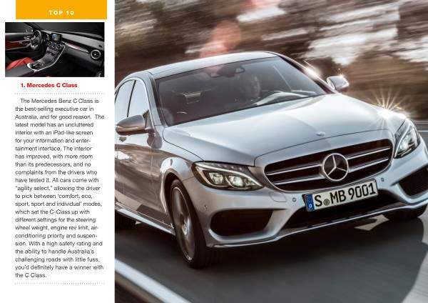 The Mercedes Benz C Class is the best-selling executive car in Australia , and for good reason . The latest model has an uncluttered interior with an iPad-like screen for your information and entertainment interface . The interior has improved , with more room than its predecessors , and no complaints from the drivers who have tested it . All cars come with “ agility select ,” allowing the driver to pick between ‘ comfort , eco , sport , sport and individual ’ modes , which set the C-Class up with different settings for the steering wheel weight , engine rev limit , airconditioning priority and suspension . With a high safety rating and the ability to handle Australia ’ s challenging roads with little fuss , you ’ d definitely have a winner with the C Class .