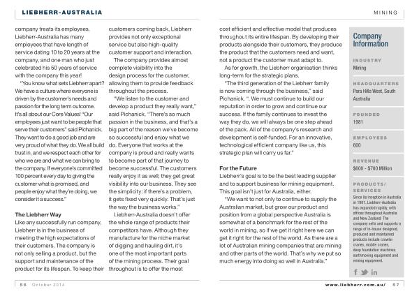 “ The third generation of the Liebherr family is now coming through the business ,” said Pichanick . “. We must continue to build our reputation in order to grow and continue our success . If the family continues to invest the way they do , we will always be one step ahead of the pack . All of the company ’ s research and development is self-funded . For an innovative , technological efficient company like us , this strategic plan will carry us far .”