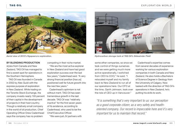 TAG Oil was founded in Canada in 2002 by Alex Guidi with the express purpose of exploration in New Zealand . While trading on the Toronto Stock Exchange , the company invests nearly 100 percent of their capital in the development of projects in their host country . Though a relatively small company in the world of oil production , Chief Operating Officer Drew Cadenhead says the company has no problem