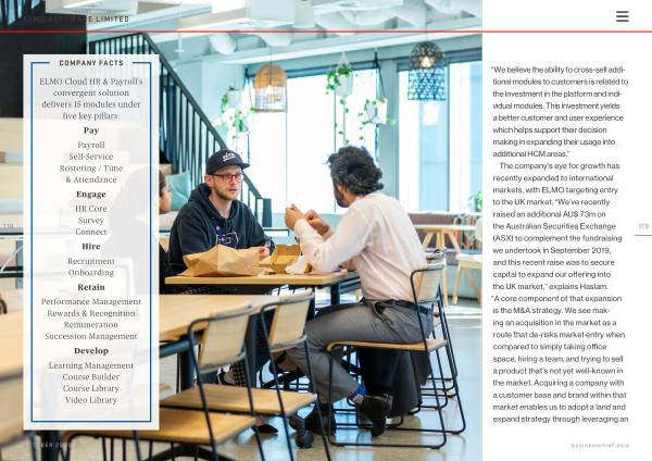 The company ’ s eye for growth has recently expanded to international markets , with ELMO targeting entry to the UK market . “ We ’ ve recently raised an additional AU $ 73m on the Australian Securities Exchange ( ASX ) to complement the fundraising we undertook in September 2019 , and this recent raise was to secure capital to expand our offering into the UK market ,” explains Haslam . “ A core component of that expansion is the M & A strategy . We see making an acquisition in the market as a route that de-risks market entry when compared to simply taking office space , hiring a team , and trying to sell a product that ’ s not yet well-known in the market . Acquiring a company with a customer base and brand within that market enables us to adopt a land and expand strategy through leveraging an