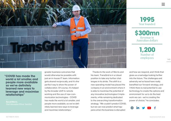 Thanks to the work of Morris and his team , TransGrid is in a robust position to take any further challenges in its stride . The shift to a new operating model has placed the company in an environment where it is able to maximise the potential of any innovative technologies it implements , while remaining dedicated to the overarching transformation strategy . “ We couldn ’ t predict COVID , but we can now predict what happens when the business is disrupted and how we respond , and I think that gives us a real edge looking further into the future . The challenges and adversity we ’ ve faced have really benefited our forward-strategy , and I think there is real potential to use technology to create the options and environment for us to do the best work we can - we ’ re creating the power of choice ,” he concludes .