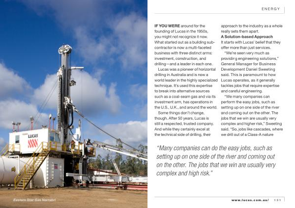 “ Many companies can do the easy jobs , such as setting up on one side of the river and coming out on the other . The jobs that we win are usually very complex and high risk .” www . lucas . com . au / 131