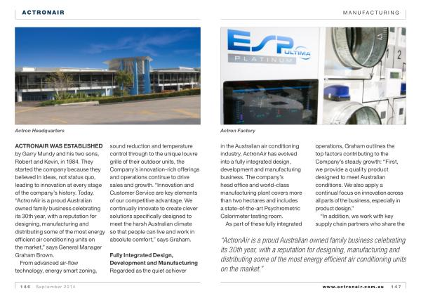 ACTRONAIR WAS ESTABLISHED by Garry Mundy and his two sons , Robert and Kevin , in 1984 . They started the company because they believed in ideas , not status quo , leading to innovation at every stage of the company ’ s history . Today , “ ActronAir is a proud Australian owned family business celebrating its 30th year , with a reputation for designing , manufacturing and distributing some of the most energy efficient air conditioning units on the market ,” says General Manager Graham Brown .