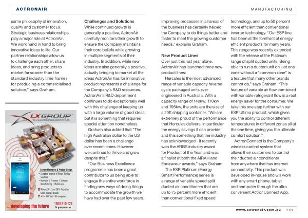 Challenges and Solutions While continued growth is generally a positive , ActronAir carefully monitors their growth to ensure the Company maintains their core beliefs while growing in multiple segments of their industry . In addition , while new ideas are also generally a positive , actually bringing to market all the ideas ActronAir has for innovative product represents a challenge for the Company ’ s R & D resources . ActronAir ’ s R & D department continues to do exceptionally well with this challenge of keeping up with a large volume of good ideas , but it is something that requires special attention nonetheless .