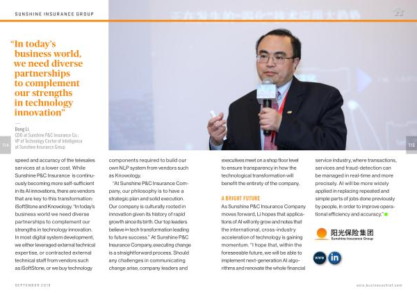 As Sunshine P & C Insurance Company moves forward , Li hopes that applications of AI will only grow and notes that the international , cross-industry acceleration of technology is gaining momentum . “ I hope that , within the foreseeable future , we will be able to implement next-generation AI algorithms and renovate the whole financial service industry , where transactions , services and fraud-detection can be managed in real-time and more precisely . AI will be more widely applied in replacing repeated and simple parts of jobs done previously by people , in order to improve operational efficiency and accuracy .”