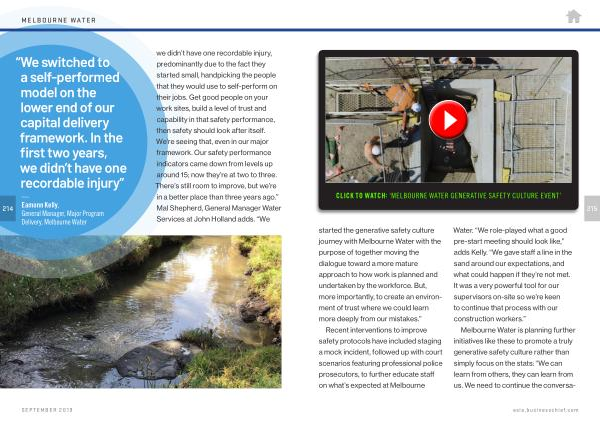 — Eamonn Kelly , General Manager , Major Program Delivery , Melbourne Water we didn ’ t have one recordable injury , predominantly due to the fact they started small , handpicking the people that they would use to self-perform on their jobs . Get good people on your work sites , build a level of trust and capability in that safety performance , then safety should look after itself . We ’ re seeing that , even in our major framework . Our safety performance indicators came down from levels up around 15 ; now they ’ re at two to three . There ’ s still room to improve , but we ’ re in a better place than three years ago .” Mal Shepherd , General Manager Water Services at John Holland adds . “ We